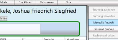 - Rechts oben über manuelle Auswahl die entsprechenden Bücher anklicken und OK. Jetzt sind alle auszuleihenden Bücher in der Vorgangsliste. Kontrollieren, ob die richtigen Häkchen gesetzt sind.