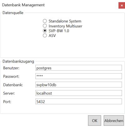 Die Auswahl SVPBW10 stellt ihnen eine Verbindung mit dem SVP-Postgre-SQL-Server her und ermöglicht den Live-Modus mit SVP. Hier haben Sie dann immer aktuellste Daten direkt aus dem Schulverwaltungsprogramm.