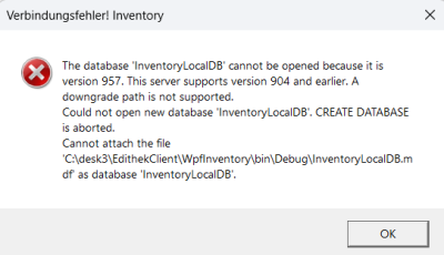 — –> Jetzt sollte Inventory mit der vorhandenen LocalDB Version starten. ←- —