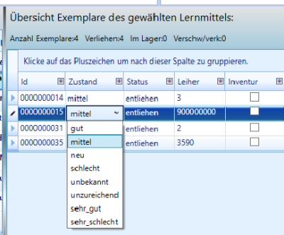 Sie sehen in der Liste alle Exemplare des zugrunde liegenden Lernmittels. Bei Auswahl eines Exemplars werden die individuellen Daten angezeigt. Z.B. wer es ausgeliehen hat, oder wie es um den Zustand bestellt ist. Sie haben auch die Möglichkeit individuelle Notizen an das jeweilige Exemplar zu heften.