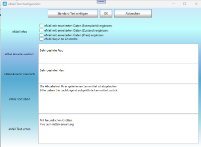 Die Form der E-Mail bzw. deren Standardtexte kann über das untenstehende Fenster angepasst werden: