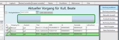 - Rechts oben auf „Buchung ausführen“. Anschließend hat jeder Schüler dieser Klasse dieses Buch. Zur Kontrolle auf einen Schüler klicken, dann taucht das Buch bei den Ausleihen des Schülers zwischen Navigator links und der Vorgangsliste auf.